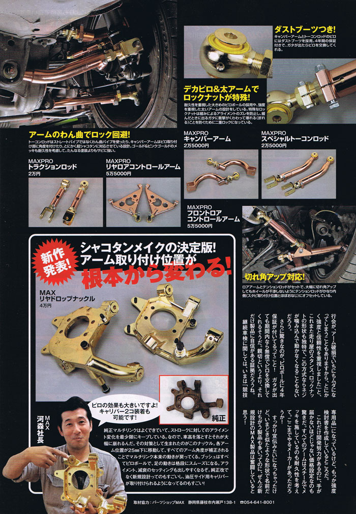 [main title] – (all new) Arm Brand, MAX Everything about these parts is designed for people who actually want to drive and drift super slammed cars! [cloud] – We support SHAKOTAN (slammed cars) [text inset on the large picture] – In the past arms were all similar looking, without variation besides color and more recently we were aware of 326 power doing something different, but this new release of MAX parts developed mostly in California has been found in Shizuoka, Japan and they are true originals! [main body] – When we first pulled up to Parts Shop MAX, we were expecting one of those importing/internet sales warehouses, but we realized this is a big automotive service shop with body & paint services, and even an engine tuning dyno. The owner Kawamori San works each and every type of service the shop provides, but his strength is in performance tuning. Don’t be afraid to ask him for any services you may need weather its for your drift car or even your work truck. This shop has been around for years, so we are sorry we never came by to do a review. Kawamori San actually makes his living mainly from his specialty drift parts business. The new suspension parts design was founded on the desire to offer a low car the same smooth suspension stroke, performance, and longevity/reliability as a normal car. Best of all, these original parts are available at a price everyone can afford. They have a sister shop, Parts Shop MAX USA as well as a new branch in New Zealand. The arms they showed me don’t look like anything I’ve ever seen. The lock nut design, The size of the pillowball and housing, anyone can take one look at this and know they are original parts. A concept point that is stressed in everything Parts Shop MAX does, is when you go to the track and break something it just ruins your day, so the overbuilt nature of these parts really helps with the typical problems that low cars have from going off course. Amazingly, they even warranty their pillowball against coming loose! Kawamori San is confident it will last for years without needing replaced. Lately its so hard to find something new, that’s why its so refreshing for us to discover these innovative parts! [the product photo captions explain the features, this is not translated directly but I will give you a quick run down] - The MAX pro toe rod is made to clear the sub frame mount on lowered cars and its adjuster is easily accessed instead of being between the sub frame tabs like other arms that are so hard to tighten. The camber arm has a special angle that not only helps clear the near by chassis pinch weld, but its bend is also upswept to clear the axle boot. Every part is heavy gauge steel with all forged critical components and every adjustment can be locked in place so it never comes loose. The pillowball is pressed into a forged steel housing using a special bearing retainer compound, set screws, and sometimes locking collars depending on the application. Silicone dust covers protect and extend the life of the maintenance free ptfe lined joints and the special pillowball side spacers allow for misalignment angle while giving max surface area for subframe mounting strength. The front lower control arm and tension rod have been combined for strength and the mounting position of the new tension rod allows for more steering angle clearance. The replacement rear drop knuckles improve roll center by 25mm for better handling and traction with less camber gain upon compression. When joined with the MAX subframe solid riser bushings, the best performance and axle joint life can be realized. Toe, traction, and RUCA mounts are all pillowball on the rear knuckle. There are even tabs for mounting a second caliper to compliment the MAX hydraulic hand brake.